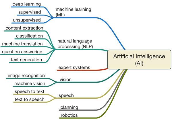 Mas Inteligência artificial é bem mais complicada do que isso, ela é divida em vários ramos, como "visão computacional", "Processamento de linguagem natural", "aprendizado de máquina", "aprendizado constante", "robôs" e por aí vai. Em cada ramo existe sua complexidade e sua forma de processar.